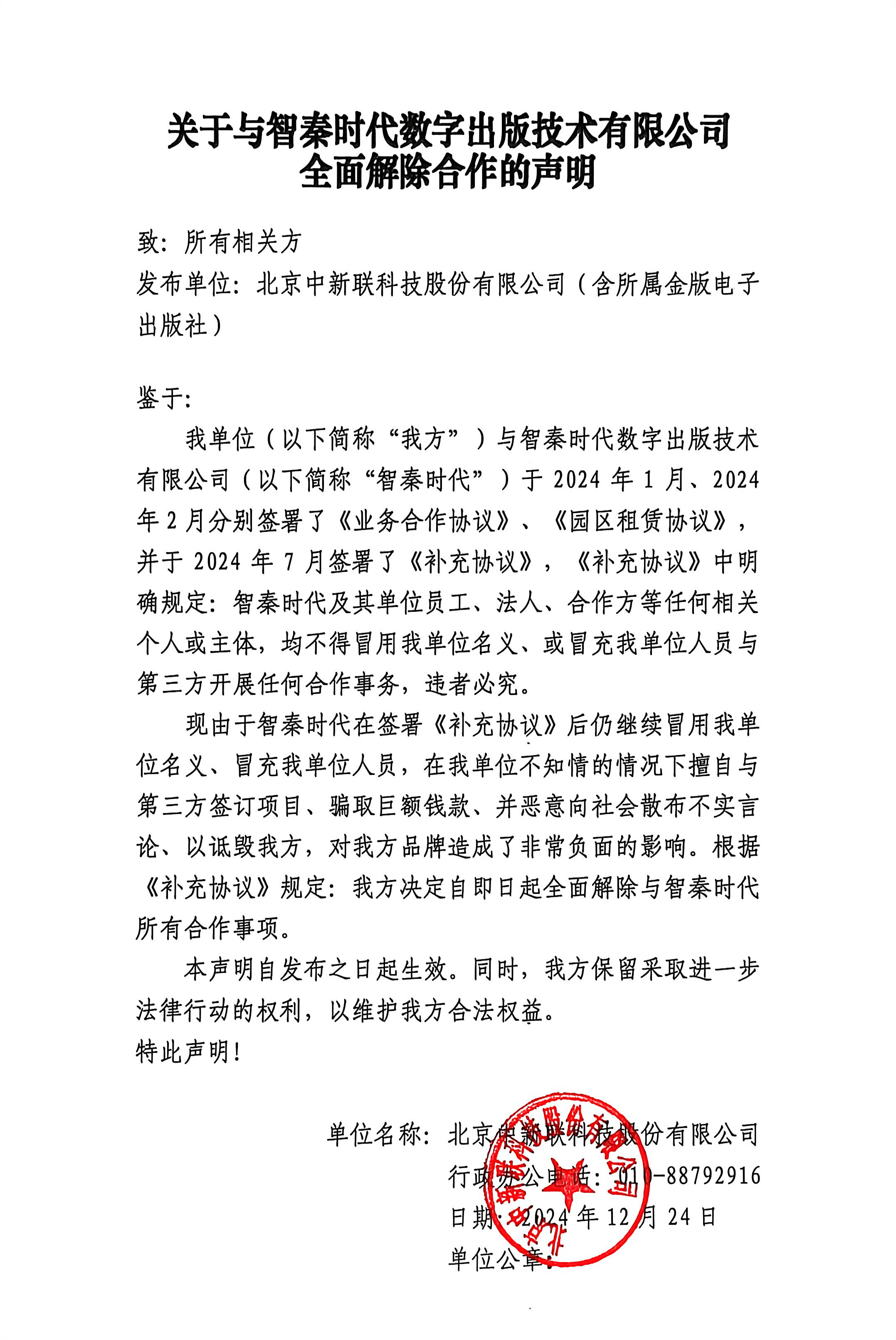 关于与智秦时代数字出版技术有限公司全面解除合作的声明
